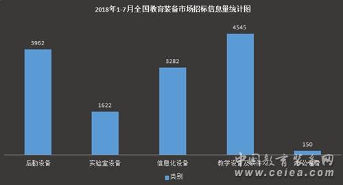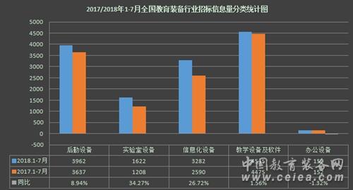 據(jù)中國教育裝備網(wǎng)2017、2018年度統(tǒng)計數(shù)據(jù),本文將對2018年度全國教育裝備行業(yè)招標采購信息進行系統(tǒng)地匯總、整理和分析,同時對比分析2017年1~7月統(tǒng)計數(shù)據(jù)(因教育裝備領(lǐng)域涵蓋范圍廣泛,為進一步做好相應的數(shù)據(jù)分析,中國教育裝備網(wǎng)從2018年8月起對全國教育裝備行業(yè)招標信息分類進行了調(diào)整,由原先的五大類調(diào)整為七大類,分別為:信息化設備(含智能平板、錄播系統(tǒng)、智慧黑板等)、后勤設備(含校園基建、安防設備、食堂設備、課桌椅等)、實驗儀器設備(含儀器儀表、實驗室平臺等)、實訓設備(含實訓系統(tǒng)、實訓設施等)、圖書館設備(含借還系統(tǒng)、微型圖書館等)、音體美設備(含樂器、體育設施、美術(shù)用品等)、其他專用設備(含心理健康、特教設備等)),揭示出我國教育裝備行業(yè)招標采購的現(xiàn)狀及一般規(guī)律,助力教育裝備市場快速健康發(fā)展。