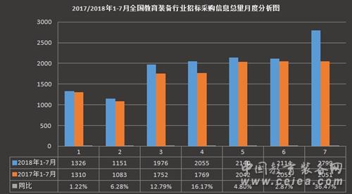圖7 2017/2018年1-7月全國教育裝備招標采購信息量月度分析圖