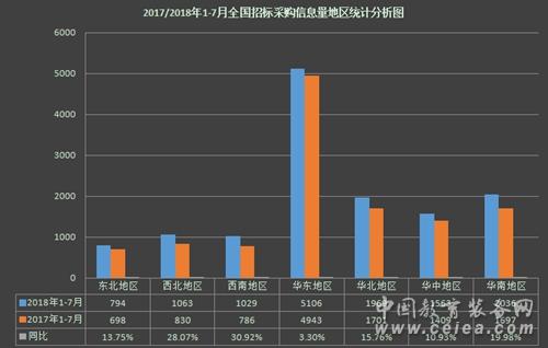 另外,從2017/2018年1~7月全國教育裝備招標采購信息量地區(qū)統(tǒng)計分析圖(見圖10)上可以看出:東北地區(qū)招標采購信息量為794條,同比增長13.75%;西北地區(qū)招標采購信息量為1063條,同比增長28.07%;西南地區(qū)招標采購信息量為1029條,同比增長30.92%;華東地區(qū)招標采購信息量為5106條,同比增長3.30%;華北地區(qū)招標采購信息量為1969條,同比增長15.76%;華中地區(qū)招標采購信息量為1563條,同比增長10.93%;華南地區(qū)招標采購信息量為2036條,同比增長19.98%。
