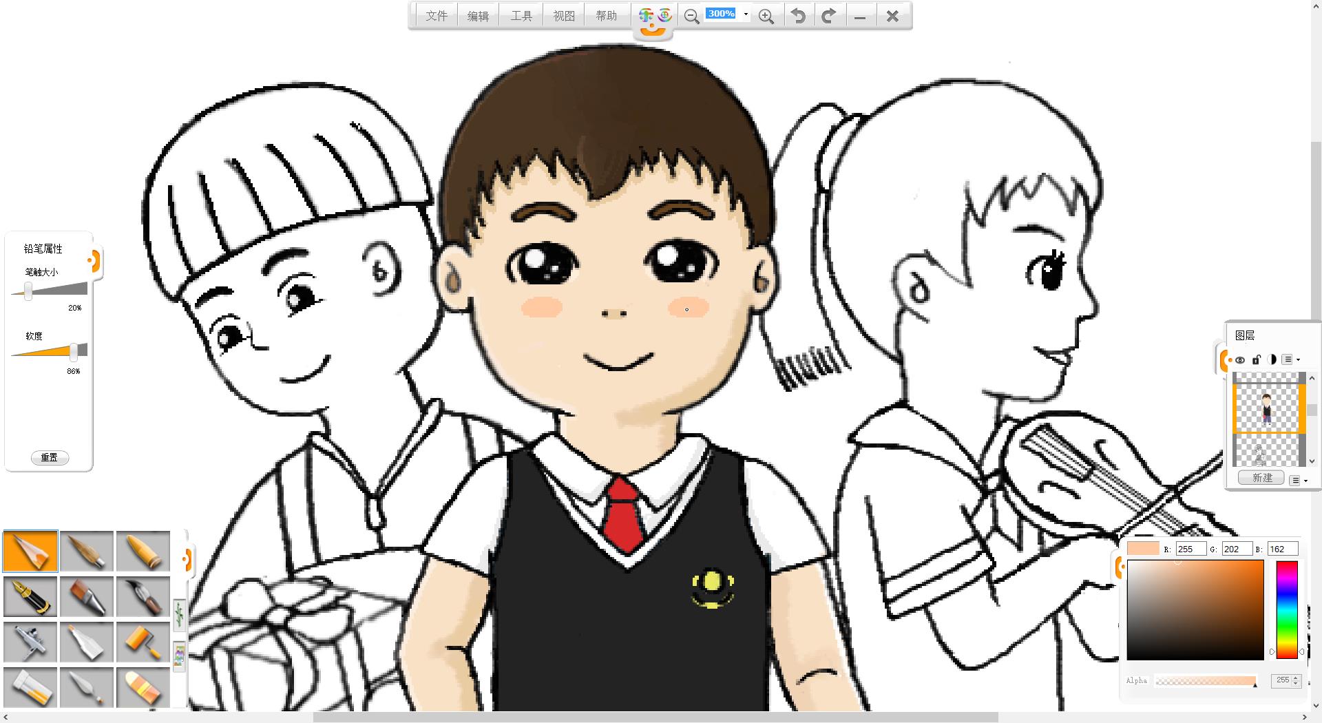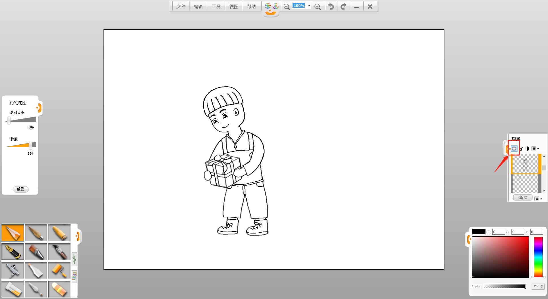 6.使用顯示/隱藏圖層按鈕,將先畫好的男孩隱藏后,新建圖層;在畫面中間偏左的位置繪制一個拿著禮物的小男孩形象。