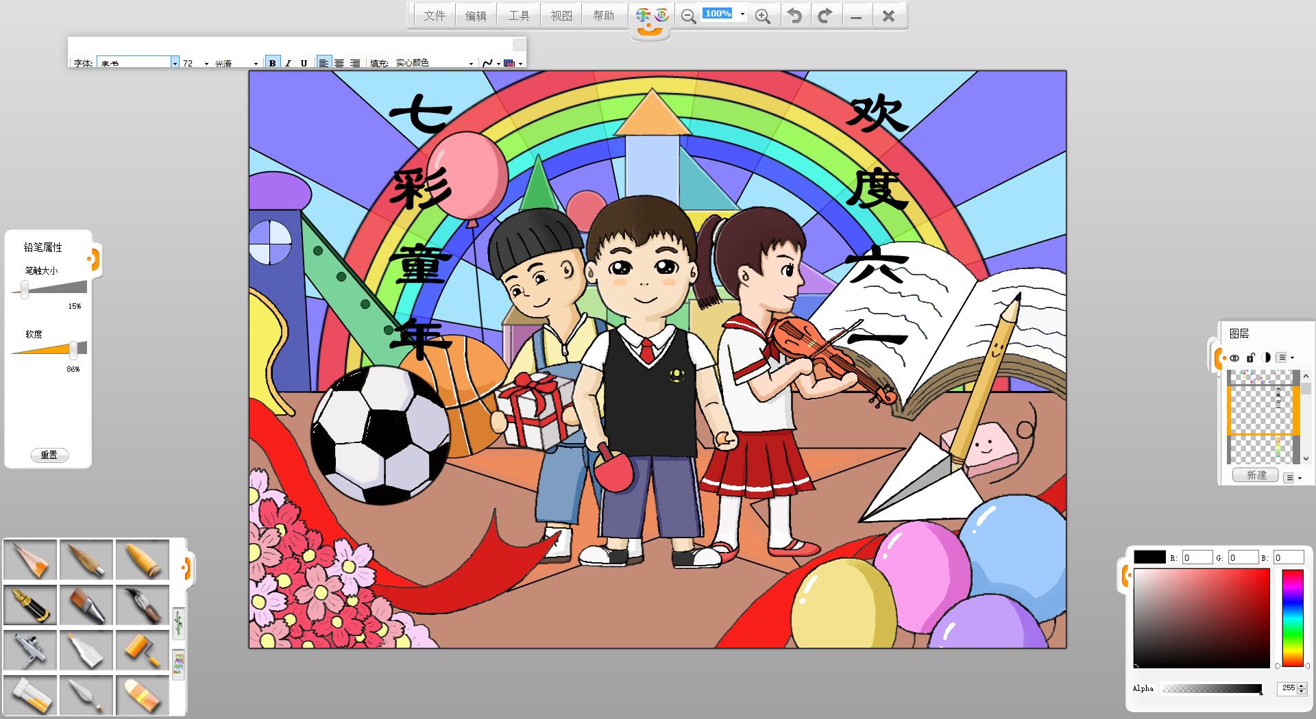 23.使用工具菜單下的文本工具,打出“七彩童年”“歡度六一”兩行字,調(diào)節(jié)合適的字體和大小。