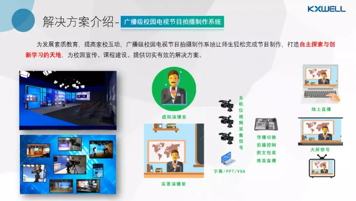 為發展素質教育,提高家�;�,廣播級校園電視節目拍攝制作系統讓師生輕松完成節目制作,打造自主探索與創新學習的天地,為校園宣傳、課程建設、提供切實有效的解決方案。應用于校園原創節目制作、校園自媒體、精品教學錄課、創客、微課、慕課制作等。