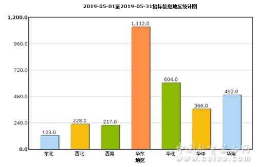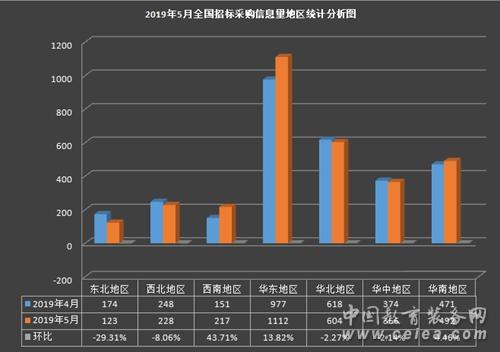 綜合5月全國招標采購信息量地區統計分析圖(如圖5所示):華南地區環比增長4.46%;華東地區環比增長13.82%;西南地區環比增長43.71%;華中地區環比下降2.14%;東北地區環比下降29.31%;華北地區環比下降2.27%;西北地區環比下降8.06%。