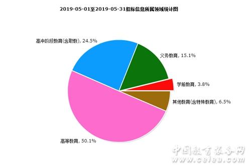 從5月招標采購信息所屬領域統計圖(如圖6所示)上看,學前教育占比為3.8%;義務教育占比為15.1%;高中階段教育(含職教)占比為24.5%;高等教育占比為50.1%;其他教育(含特殊教育)占比為6.5%。