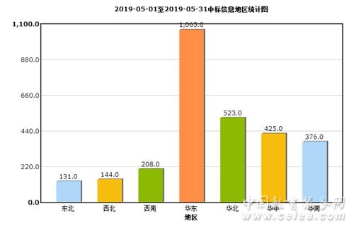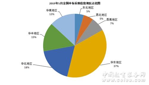 從5月中標信息地區統計圖(如圖8所示)和全國中標信息地區占比圖(如圖9所示)來看:華東地區中標信息量為1065條,占比37%;華北地區中標信息量為523條,占比18%;華中地區中標信息量為425條,占比15%;華南地區中標信息量為376條,占比13%;西南地區招中標信息量為208條,占比7%;東北地區中標信息量為131條,占比5%;西北地區中標信息量為144條,占比5%。