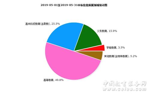 5月中標信息所屬領域統計圖,如圖10所示:學前教育占比為3.5%;義務教育占比為15.9%;高中階段教育(含職教)占比為25.5%;高等教育占比為49.8%;其他教育(含特殊教育)占比為5.2%。