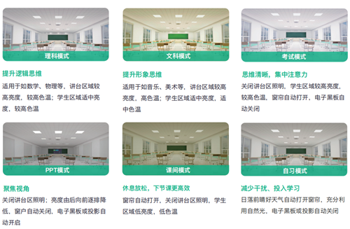 同時,數言智慧光環境針對不同教學活動,提供文科、理科、PPT、自習、課間休息、考試、表演、放學等十多種場景模式。