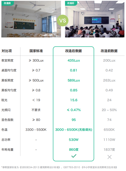 數據以一間教室為例,改造前熒光燈9盞,普通黑板燈2盞,教室照度200Lux,改造后使用數言智慧護眼燈9盞+黑板燈2盞,確保教室照度達到400Lux左右,有效預防近視,為學生與教師打造一個更健康舒適的教學環境。