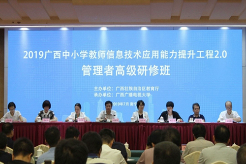 7月19日,全區各市縣教育局主管領導、“能力提升工程”項目辦負責人以及自治區專家委員會成員300余人齊聚南寧,參加由自治區教育廳主辦、廣西廣播電視大學承辦的2019年廣西中小學教師信息技術應用能力提升工程2.0管理者高級研修班——廣西“能力提升工程2.0”啟動會。