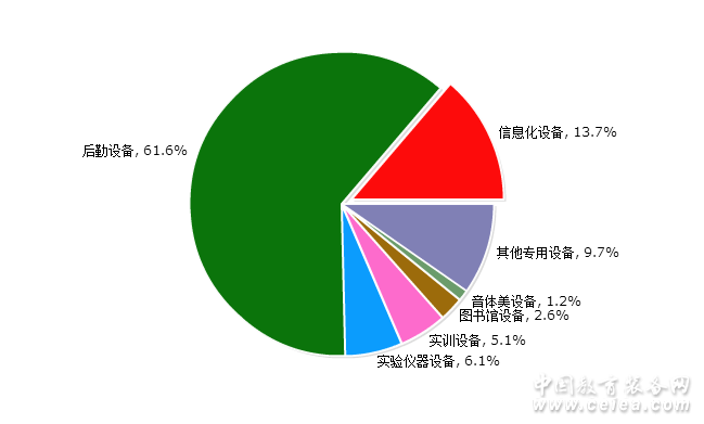 7月份教育裝備行業(yè)招標(biāo)采購信息分類占比情況如圖1所示:后勤設(shè)備招標(biāo)采購信息共計3403條,占61.63%;信息化設(shè)備招標(biāo)采購信息共計759條,占13.75%;實驗儀器設(shè)備招標(biāo)采購信息共計336條,占6.08%;實訓(xùn)設(shè)備招標(biāo)采購信息共計282條,占5.11%;圖書館設(shè)備招標(biāo)采購信息共計142條,占2.57%;音體美設(shè)備招標(biāo)采購信息共計66條,占1.20%;其他專用設(shè)備招標(biāo)采購信息共計534條,占9.67%。