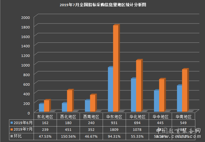 7月份,根據(jù)中國教育裝備網(wǎng)對國內(nèi)教育裝備招中標(biāo)采購信息量的數(shù)據(jù)統(tǒng)計,國內(nèi)教育裝備市場招標(biāo)采購信息總量為5522條,環(huán)比增長72.99%。由此可見,暑期的到來,使得國內(nèi)教育裝備招標(biāo)采購信息量呈現(xiàn)大幅增長的趨勢。
