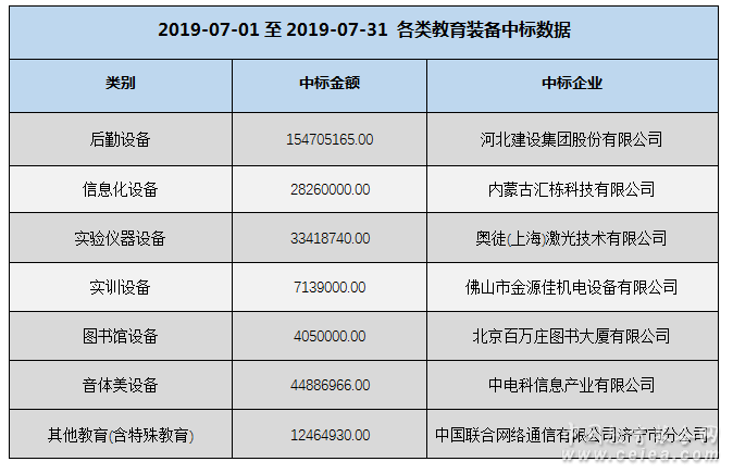 附:2019年7月已有教育裝備類別數(shù)據(jù)中累積最高中標(biāo)金額及其所屬企業(yè)。