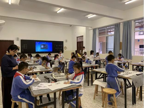 在松崗實驗學(xué)校在UCN智慧教室中,就有一場精彩的軟筆書法比賽。