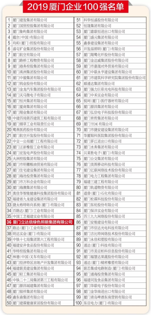 照明行業(yè)首位!立達(dá)信榮耀登榜“2019廈門企業(yè)100強(qiáng)”!