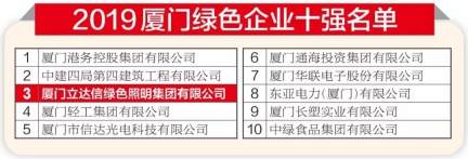 100家企業(yè)從廈門幾十萬家企業(yè)中脫穎而出,榮耀登榜。立達(dá)信在100強(qiáng)榜單中排名第36位,位列照明行業(yè)首位,并入選2019廈門綠色企業(yè)十強(qiáng)榜單。