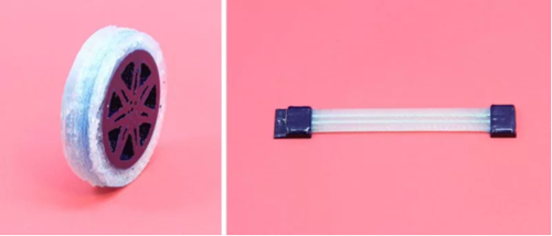 用新型3D打印機(jī)打印的一個輪子(左圖)和一根柔性導(dǎo)電帶。