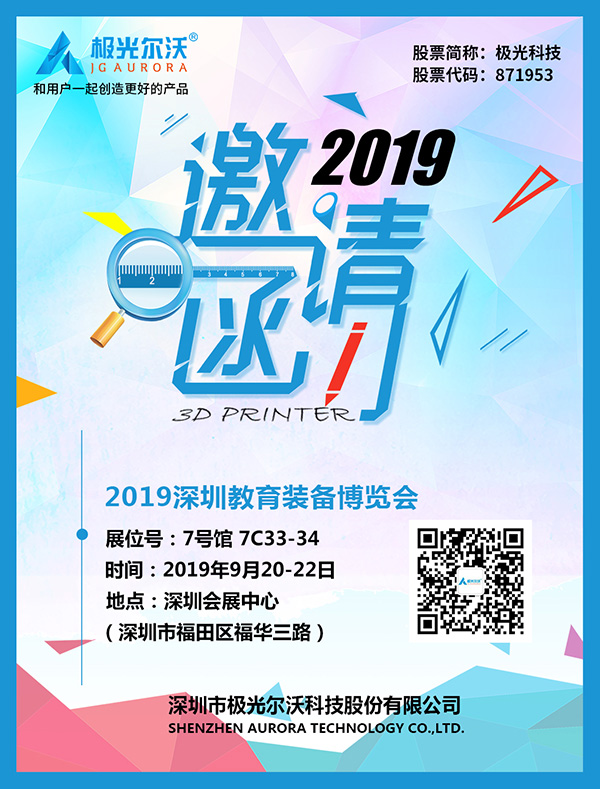 極光爾沃即將亮相2019年9月20-22日深圳教育裝備博覽會,我們誠摯邀請您蒞臨我們的展位,親臨現(xiàn)場共同見證3D打印機桌面級3D打印機A6,光固化3D打印機 G3等型號精彩亮相,歡迎新老客戶和我們一同探討3D打印教育解決方案,了解最前沿的創(chuàng)新教育理念,精彩不容錯過!