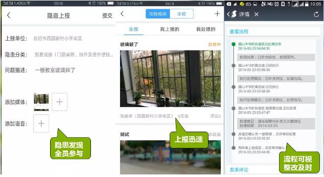 天立泰校園安全風險防控體系,是如何進行校園安全內的安全隱患做到及時發現,并實施整改的呢?校園安全平臺中的隱患排查功能,恰恰就對應于這項《緊急通知》。學校中巡檢人員在發現校園的任何隱患后,都可以通過手機端拍照上傳隱患情況,系統會自動將隱患情況上報給相應的校園管理者,管理者在接收到隱患通知后可及時對隱患進行處理,進行排查、整改,切實消除校園中存在的安全隱患。