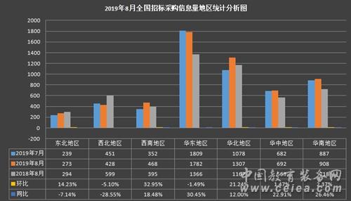 綜合8月全國(guó)招標(biāo)采購(gòu)信息量地區(qū)統(tǒng)計(jì)分析圖(如圖5所示):西北地區(qū)環(huán)比下降5.10%,同比下降28.55%;華東地區(qū)環(huán)比下降1.49%,同比增長(zhǎng)30.45%;華南地區(qū)環(huán)比增長(zhǎng)2.37%,同比增長(zhǎng)26.46%;華北地區(qū)環(huán)比增長(zhǎng)21.24%,同比增長(zhǎng)12.00%;華中地區(qū)環(huán)比增長(zhǎng)1.47%,同比增長(zhǎng)22.91%;東北地區(qū)環(huán)比增長(zhǎng)14.23%,同比下降7.14%;西南地區(qū)環(huán)比增長(zhǎng)32.95%,同比增長(zhǎng)18.48%。