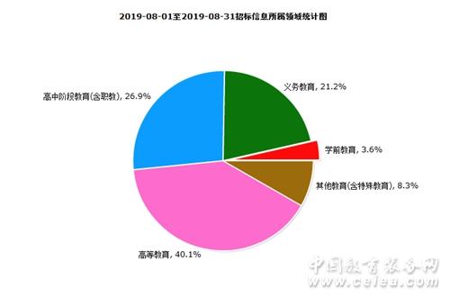 8月份招標(biāo)采購(gòu)信息所屬領(lǐng)域統(tǒng)計(jì)情況如圖6所示:學(xué)前教育占比為3.6%;義務(wù)教育占比為21.2%;高中階段教育(含職教)占比為26.9%;高等教育占比為40.1%;其他教育(含特殊教育)占比為8.3%。
