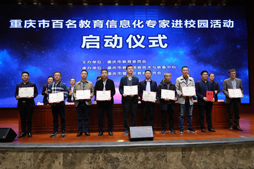 市教育技裝中心黨總支書記姚友明宣讀了《重慶市教育委員會關于公布百名教育信息化專家進校園活動結對專家和學校名單的通知》.隨后,與會領導為專家代表頒發聘書。