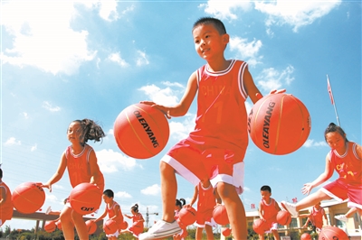 山東濰坊高密市恒濤雙語學校學生在表演自編的籃球操。孫哲 攝(資料圖片)