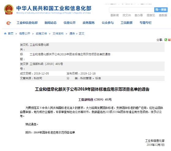 12月18日,中華人民共和國工業(yè)和信息化部發(fā)布《關(guān)于公布2019年團體標(biāo)準(zhǔn)應(yīng)用示范項目名單的通告》(工信部科函〔2019〕401號),遴選出103項2019年團體標(biāo)準(zhǔn)應(yīng)用示范項目。由中國教育裝備行業(yè)協(xié)會發(fā)布并歸口的團體標(biāo)準(zhǔn)T/JYBZ 005—2018《中小學(xué)教室照明技術(shù)規(guī)范》成功入選工信部2019年團體標(biāo)準(zhǔn)應(yīng)用示范項目,見圖1。