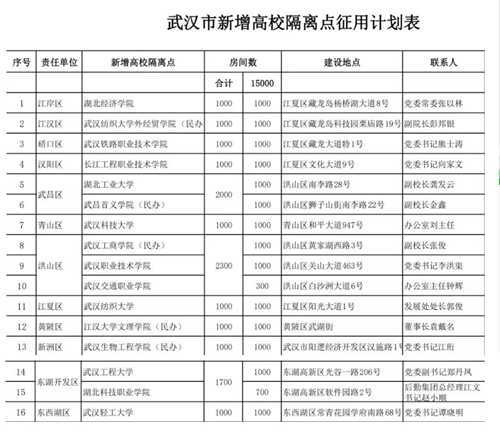 18日,武漢市新型肺炎防控指揮部床位保障組發布了關于下達16所省屬高校集中隔離點儲備任務的緊急通知。