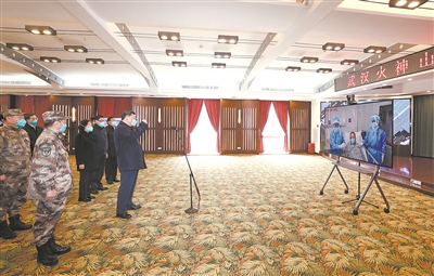 在火神山醫(yī)院指揮中心,習(xí)近平聽(tīng)取醫(yī)院建設(shè)運(yùn)行、患者收治、醫(yī)務(wù)人員防護(hù)保障、科研攻關(guān)等情況介紹。習(xí)近平指出,疫情發(fā)生以來(lái),包括軍隊(duì)在內(nèi)的廣大醫(yī)務(wù)工作者發(fā)揚(yáng)特別能吃苦、特別能戰(zhàn)斗的精神,義無(wú)反顧奔赴湖北和武漢,毫無(wú)畏懼投入防控救治工作,日夜奮戰(zhàn),舍生忘死,不負(fù)重托,不辱使命,同時(shí)間賽跑,與病魔較量,為武漢疫情防控工作作出了重要貢獻(xiàn)。軍隊(duì)醫(yī)務(wù)人員牢記我軍宗旨,召之即來(lái),來(lái)之能戰(zhàn),戰(zhàn)之能勝,為黨旗、軍旗增添了光彩。滄海橫流,方顯英雄本色。你們真正做到了救死扶傷、大愛(ài)無(wú)疆。你們是光明的使者、希望的使者,是最美的天使,是真正的英雄!黨和人民感謝你們!