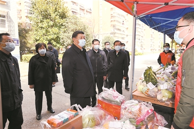 在社區(qū)生活物資集中配送點(diǎn),習(xí)近平詳細(xì)詢問(wèn)米面糧油和新鮮蔬菜水果等生活物資的采購(gòu)和供應(yīng)情況,強(qiáng)調(diào)要千方百計(jì)保障好群眾基本生活。在察看社區(qū)警務(wù)室、衛(wèi)生服務(wù)站、物業(yè)中心等運(yùn)行情況后,習(xí)近平來(lái)到社區(qū)黨群服務(wù)中心,了解社區(qū)實(shí)行網(wǎng)格化管理、聯(lián)防聯(lián)控、群防群治工作情況,對(duì)他們的工作表示肯定。