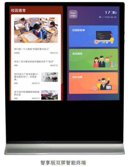 1、一臺終端實現多種賦能,可滿足多維度教育需求,支持文化展示、校園 導視、通知宣傳、大數據展示牌等應用。