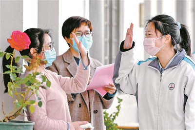 4月12日,浙江省湖州市長興縣夾浦鎮(zhèn)中學一名初三學生,返校后見到久別的校園與老師,開心地與進行安全檢測的老師擊掌。譚云俸 攝