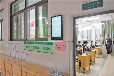 “歡迎你們回到學(xué)校。”早晨6點(diǎn)剛過(guò),武昌實(shí)驗(yàn)中學(xué)的高三學(xué)生就陸續(xù)到校了。記者在現(xiàn)場(chǎng)看到,該校在校門(mén)口設(shè)置通道分流學(xué)生,同時(shí),學(xué)生與教師分不同通道,學(xué)生入校前先洗手,然后經(jīng)檢測(cè)點(diǎn)測(cè)溫后進(jìn)入班級(jí)。測(cè)溫點(diǎn)分雙通道通行,學(xué)生無(wú)須停留,在經(jīng)過(guò)測(cè)溫儀時(shí)會(huì)自動(dòng)測(cè)溫,若體溫正常,會(huì)出現(xiàn)語(yǔ)音提示。在經(jīng)過(guò)測(cè)溫點(diǎn)后,先前沒(méi)有洗手的學(xué)生,在校內(nèi)洗手后,隨后方可進(jìn)入教室,而班主任則在教室內(nèi)負(fù)責(zé)學(xué)生秩序。
