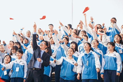 “教育首先是精神成長,其次才成為科學獲知的一部分。”陳立群在臺江民中從“心靈喚醒”和“精神教育”入手,改變苗鄉孩子的精神面貌,為他們點燃夢想與希望。圖為陳立群和學生一起舉行“放飛夢想”活動。(新華社記者 謝希瑤/攝)