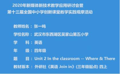 近期公布的“2020年新媒體新技術教學應用研討會暨第十三屆全國中小學創新課堂教學實踐觀摩活動”網絡課例遴選結果的通知,共有192位老師使用希沃易課堂參賽并獲獎。今天為大家帶來一節優秀的英語課例解析,一起來看看來自武漢市東西湖區吳家山第五小學的張一鳴老師是怎么設計這堂課的吧: