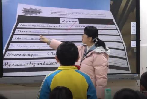 課堂的最后一個環節,張老師決定讓學生進行自主寫作,嘗試描述自己的房間,鍛煉實際應用能力。張老師利用希沃易課堂的拍照上傳功能,讓學生將作答結果上傳到大屏上,并隨機挑選了一份學生作業,一邊批注,一邊讓學生跟讀,不斷強化學生的口語表達。