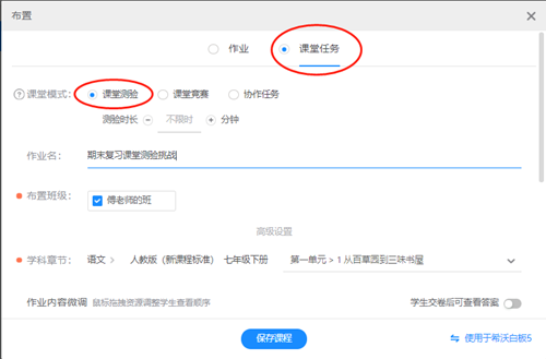 ①需要提前在教師空間設置好對應習題,加入資源包后設定為課堂測驗任務;