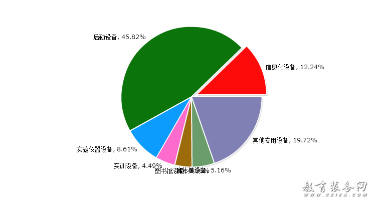 根據對教育裝備細分的歸納,教育裝備網將教育裝備具體劃分為七大類,即信息化設備(含智能平板、錄播系統、智慧黑板等),后勤設備(含校園基建、安防設備、食堂設備、課桌椅等),實驗儀器設備(含儀器儀表、實驗室平臺等),實訓設備(含實訓系統、實訓設施等),圖書館設備(含借還系統、微型圖書館等),音體美設備(含樂器、體育設施、美術用品等),其他專用設備(含創客教育、心理健康特教設備等)。