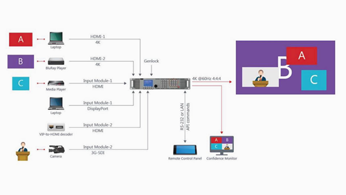 它具有超低延時,以單像素為基準,精確調節,模組化設,支持4K 50/60HZ 4:4:4影像輸出。同時還具有四圖層畫面,各圖層可任意切換大小位置,額外還擁有一個靜態背景圖層,真正無縫切換和漸進漸出。