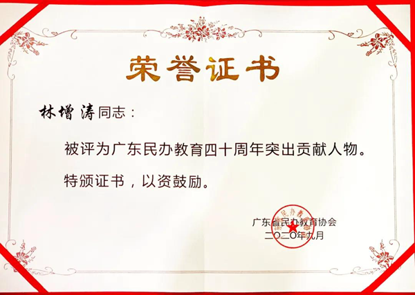 鳳藻煥新篇,龍濤霞蔚;冀足賡彩筆,方正溢彩。憶往昔,歲月崢嶸;看今朝,春華秋實。在廣東省民辦教育協會為展示改革開放四十年來廣東民辦教育取得的輝煌成就,記錄廣東民辦教育四十年的發展歷程,總結廣東民辦教育發展的先進經驗,大力宣傳為民辦教育事業發展做出突出貢獻的機構和個人,提升廣東民辦教育的社會影響力,所組織開展的廣東民辦教育四十周年“突出貢獻人物·機構”評選活動中,廣東龍濤教育發展有限公司董事長林增濤先生榮獲“廣東民辦教育四十周年突出貢獻人物”榮譽稱號!作為民辦教育義務教育均衡發展的優秀代表學校,我校喜獲“廣東民辦教育四十周年突出貢獻機構”榮譽稱號。