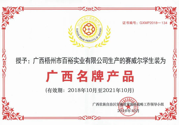 3、具有合格的產(chǎn)品質(zhì)量,百裕集團(tuán)在各個(gè)生產(chǎn)環(huán)節(jié)具有嚴(yán)格的質(zhì)量把控體系來確保百裕學(xué)生裝的優(yōu)秀品質(zhì)。公司的產(chǎn)品品質(zhì)得到了權(quán)威監(jiān)管部門的認(rèn)可,先后獲得了“中國著名品牌”、“廣西名牌產(chǎn)品”、“守信用、重合同”、“質(zhì)量管理標(biāo)桿”等稱號,被中國質(zhì)量信用評價(jià)中心評定為AAA+級中國質(zhì)量信用企業(yè)。