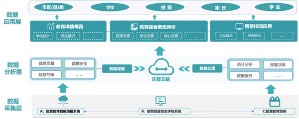 當前很多學校引入了教育信息化裝備,但這些各自獨立的“端”未被充分利用,形成了一個個業務、數據、資源的孤島。云蝶科技在接入“端”的基礎上,結合教育業務場景建立多元特色化的分析點,匯聚多元數據到樂智云腦教育數據中心進行數據處理與分析,從而面向多元主體,靈活化輸出相關報表,構建出全角色、全維度、全周期的教育數據綜合架構。