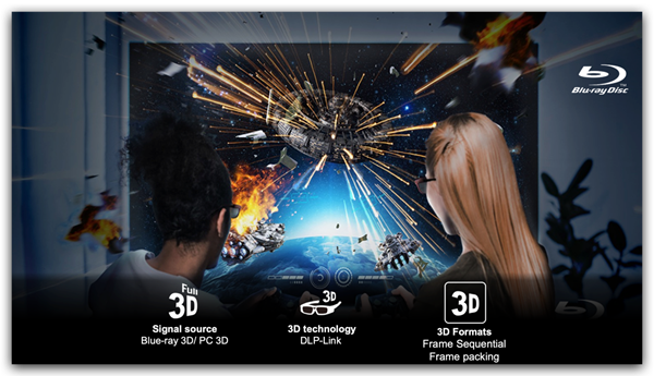 刷新率是顯示設備每秒更新新圖像的次數。240Hz表示每秒刷新240次。刷新率越高,您的監視器每秒可以顯示的幀數就越多,屏幕上的圖像顯示就越平滑。開啟“增強游戲”模式,圖像輸出為1080P, 240Hz刷新率,是標準PC游戲顯示器的4倍。UHD516高達240Hz刷新率與4ms低輸入延遲,另外,支持MVD 3D視頻編碼技術,搭配DLP 3D眼鏡,帶來沉浸式的觀影及游戲體驗。