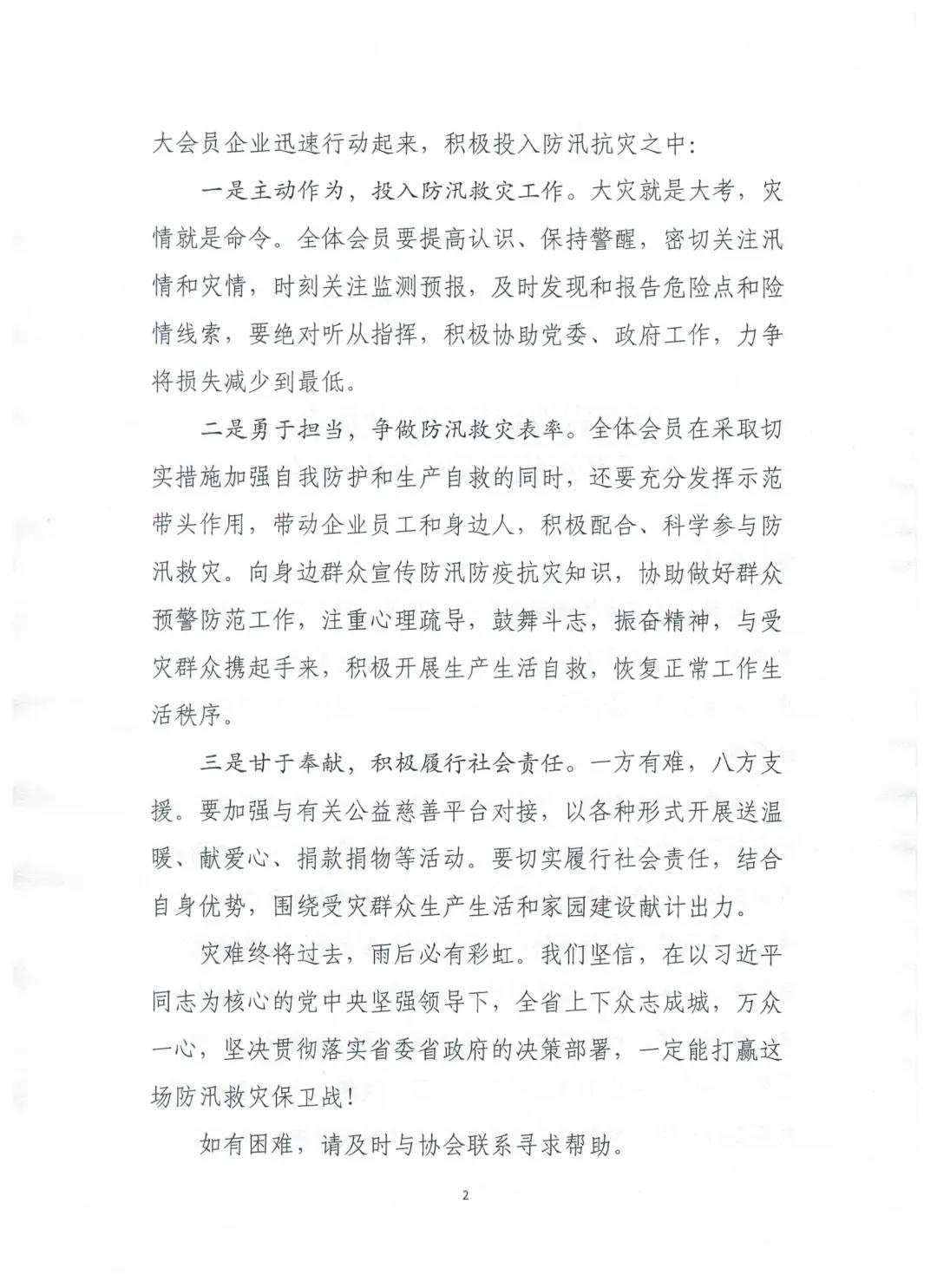 二是勇于擔當,爭做防汛救災表率。全體會員在采取切實措施加強自我防護和生產自救的同時,還要充分發揮示范帶頭作用,帶動企業員工和身邊人,積極配合、科學參與防汛救災。向身邊群眾宣傳防汛防疫抗災知識,協助做好群眾預警防范工作,注重心理疏導,鼓舞斗志,振奮精神,與受災群眾攜起手來,積極開展生產生活自救,恢復正常工作生活秩序。