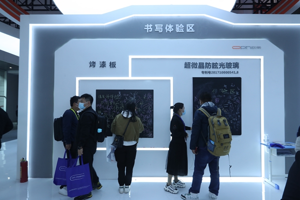 在新品體驗區,歐帝也帶來了令人耳目一新的新一代的四邊紅外記憶黑板,其粉筆板書的雙屏顯示功能和記憶云存儲功能令現場的老師感到驚喜。在傳統課堂中,由于黑板尺寸的限制,老師在板書書寫時,在中間位置寫滿后,會自然的在黑板的左右兩側書寫,而學生則由于座位的角度問題,看不清兩側的板書,以至于不能及時的抄寫板書。這一現象,幾乎是所有經歷過傳統黑板教育師生的共同記憶。