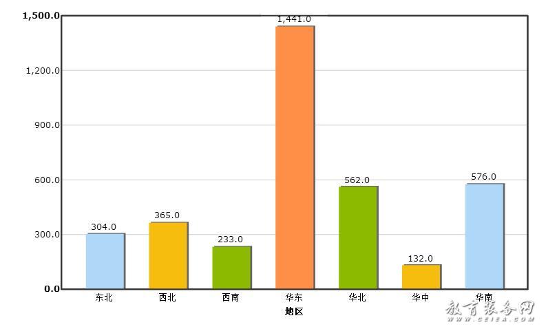 根據(jù)9月份收集到的教育裝備招標(biāo)采購信息(見圖2、圖3):教育裝備招標(biāo)采購區(qū)域信息數(shù)據(jù)共3814條(招標(biāo)采購信息地區(qū)設(shè)置為單選項(xiàng))。其中,華東地區(qū)招標(biāo)采購信息量1561條,占區(qū)域信息量的40.93%;華北地區(qū)招標(biāo)采購信息量664條,占區(qū)域信息量的17.41%;華南地區(qū)招標(biāo)采購信息量422條,占區(qū)域信息量的11.06%;西南地區(qū)招標(biāo)采購信息量394條,占區(qū)域信息量的10.33%;西北地區(qū)招標(biāo)采購信息量307條,占區(qū)域信息量的8.05%;華中地區(qū)教育裝備招標(biāo)采購信息量均為250條,占區(qū)域信息量的6.55%;東北地區(qū)招標(biāo)采購信息量216條,占區(qū)域信息量的5.66%。