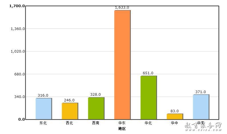 11月份教育裝備中標采購區域信息數據共3628條(中標信息區域設置為單選項)見圖6、圖7,華東地區中標信息量1633條,占區域信息量的45.01%;華北地區中標信息量651條,占區域信息量的17.94%;華南地區中標信息量371條,占區域信息量的10.23%;西南地區中標信息量328條,占區域信息量的9.04%;東北地區教育裝備中標信息量316條,占區域信息量的8.71%;西北地區中標信息量246條,占區域信息量的6.78%;華中地區中標信息量83條,占區域信息量的2.29%。