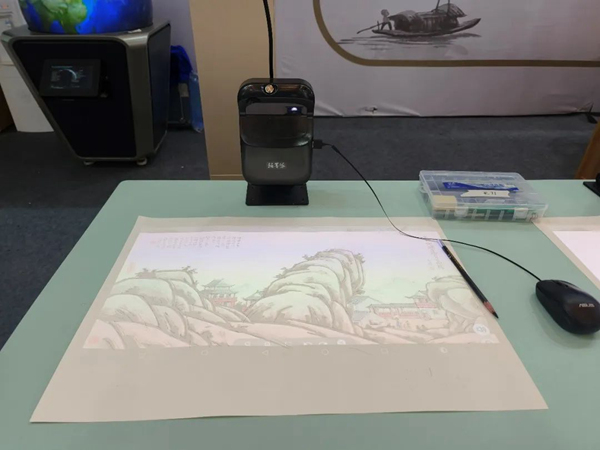 云書畫教學系統是結合書法、繪畫兩大教學模塊系統,主要以微投投射式的方式結合新中式書法桌及現代美術桌來展現書法、繪畫的資源內容。書法桌貼上毛氈,鋪上宣紙,可以完美的體驗傳統書寫方式。美術桌鋪上水粉紙、水彩紙、素描紙等常規繪畫用紙,同時配置繪畫平板,實現數字繪畫場景及水彩、水粉、素描、國畫等傳統教學場景的全覆蓋。