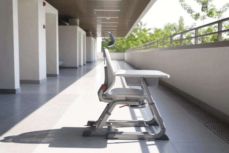 在日常上課時,符合國家標準人體工程學的座椅如一位守護者,以全包裹式座椅設計,貼合學生的脊柱成長,靠背、坐墊的人機曲度設計,有效舒緩學生脊柱壓力,靠背的全包裹式支撐,輔助維持坐姿中正平衡,預防脊柱側彎。