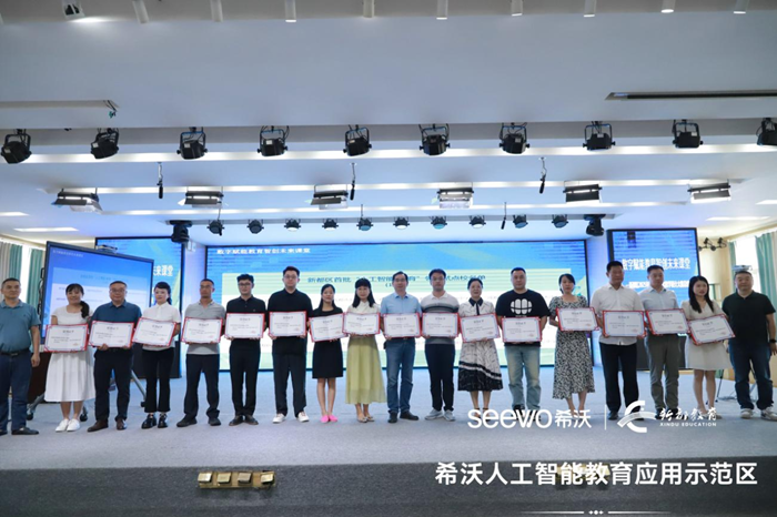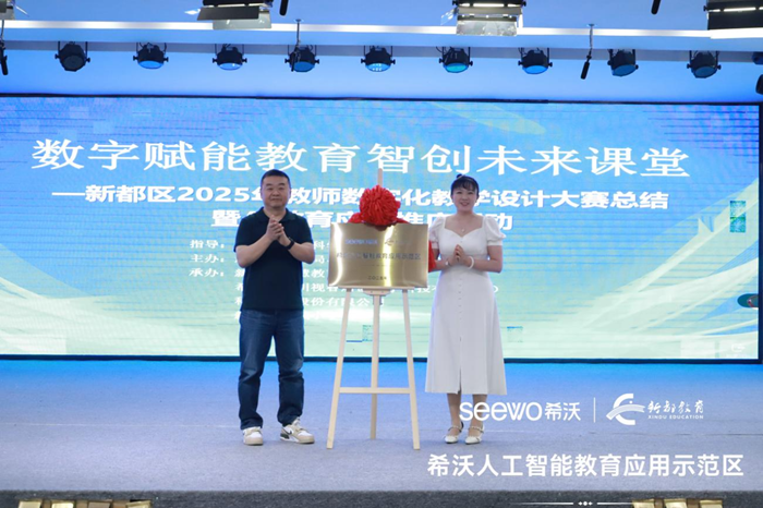 新都區(qū)教科院魏院長(zhǎng)與希沃成都區(qū)域業(yè)務(wù)負(fù)責(zé)人高總共同為新都區(qū)“希沃人工智能示范區(qū) ”揭牌,標(biāo)志著區(qū)域與企業(yè)在深化AI教育應(yīng)用上達(dá)成戰(zhàn)略合作。